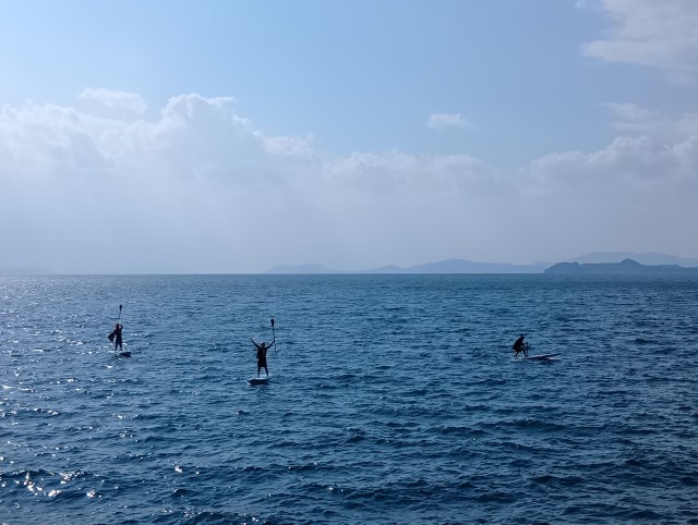 カッター体験で教えてくれた方が、海から手を振ってくれていました。ハロゥインのコスプレ。最後まで楽しませてくれました。