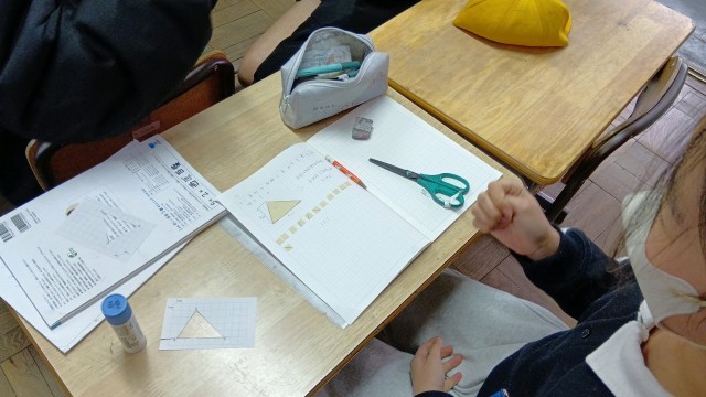 三角形とにらめっこをしながら、線を入れたり、同じ三角形を合わせたりなど、試行錯誤していました。