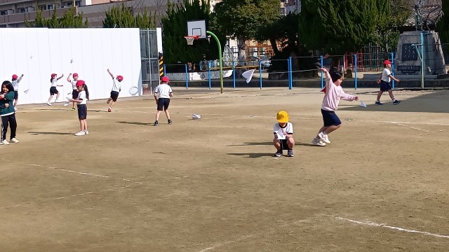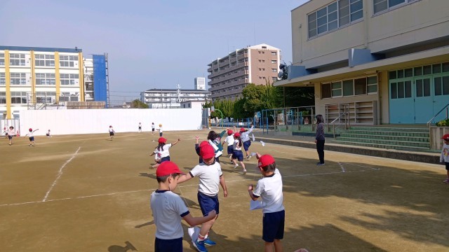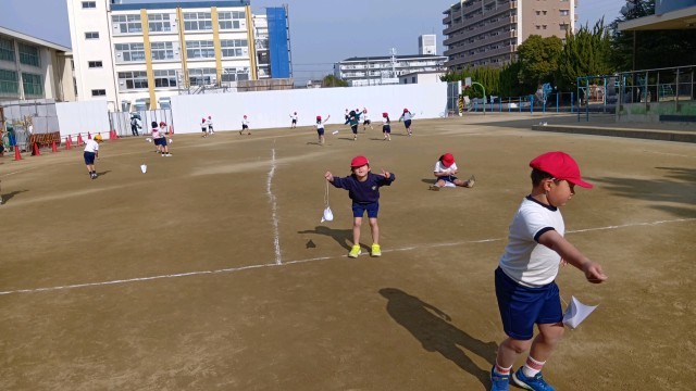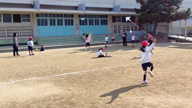 1年生が運動場でたこあげをしていました。