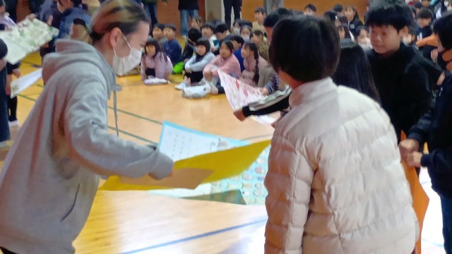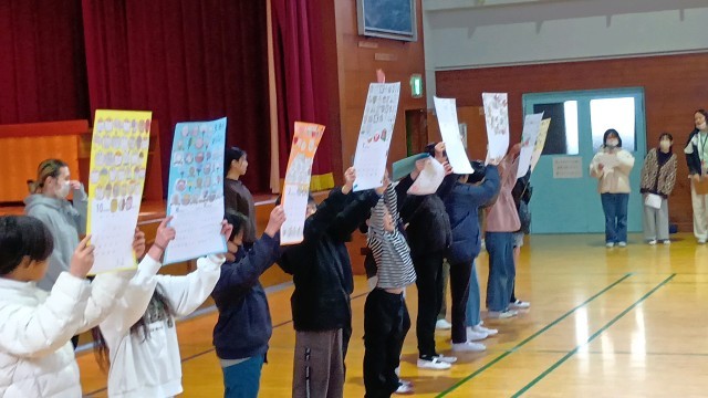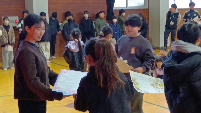 給食委員会の代表から給食調理員さん、栄養士さんに感謝の言葉を伝え、その後、各クラス手作りのカレンダーをプレゼントしました。