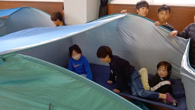 非難テントや消火器などの体験スペースもあります。