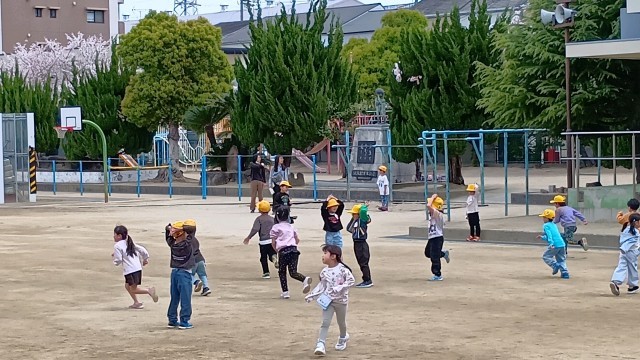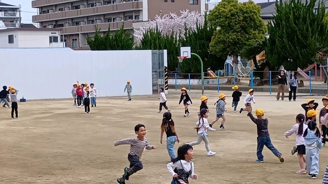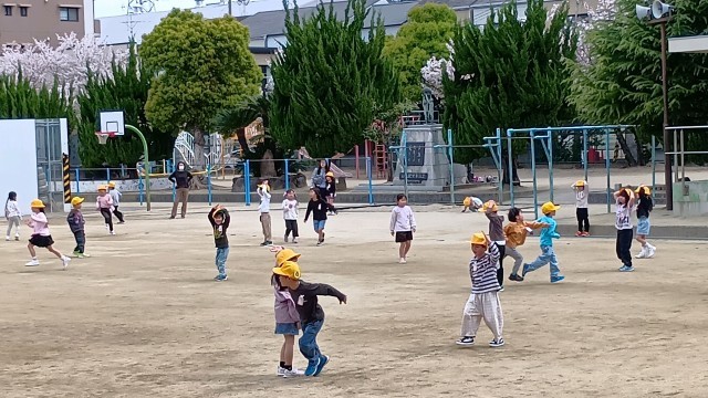 今は工事中で狭い運動場ですが、1年生の子どもたちは元気に走り回っていました。