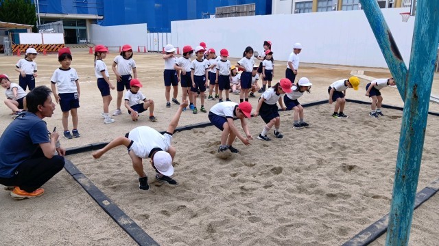 立ち幅跳びでは、手を振って少し上に向かって跳ぶようにコツをつかむと、最初より遠くに跳ぶことができていました。