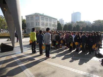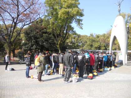 現地からは1枚の写真でしか発信できませんでしたので、今日は、広島平和記念公園内で行った「原爆の子の像」の前での平和の集いと慰霊碑めぐりの様子をふり返ります。