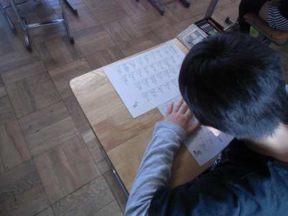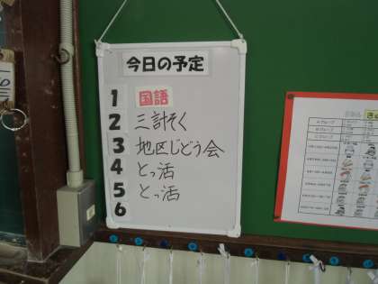 南郷小学校では1日の流れを黒板かホワイトボードに提示することにしています。こうすることによって、どの子にも一日の流れがわかり、混乱が防げます。2枚目は特活の時間です。係決めをしていました。積極的な子が多く、感心しました。3枚目、漢字の勉強をしていました。全員、真剣。