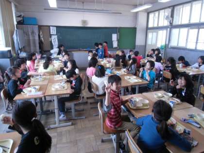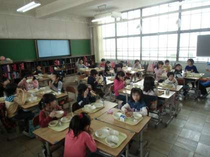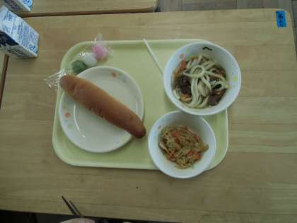 今日の給食は肉うどん、切干大根、パン、牛乳でした。校長先生は、42年ぶりに小学校の給食を食べました。おいしいおいしい。