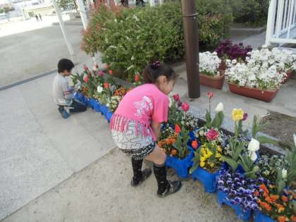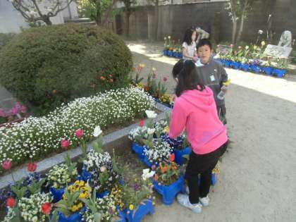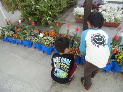 南門を入ったところに花が咲いています。子どもたちが水をやりに来ていました。一斉にやってきます。