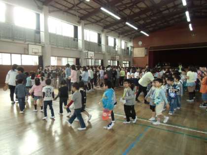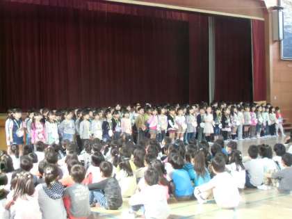 本日の児童集会で、一年生を迎える会を行いました。児童会の役員の人がお祝の言葉を言いました。
