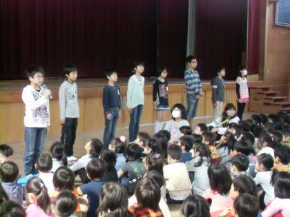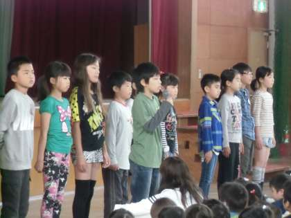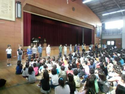 一年生を迎える会では、2年から6年生までが、校歌を歌い、児童会からお祝の言葉があり、お返しに一年生が「ドキドキの一年生」を歌いました。どちらも立派でしたよ。そのあと、児童集会があり、児童会役員と4年から6年の代議員の皆さんが自己紹介を、全員立派に行いました。児童会会長のあいさつは特によかったです。緊張したでしょうね。すばらしい。