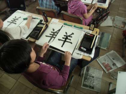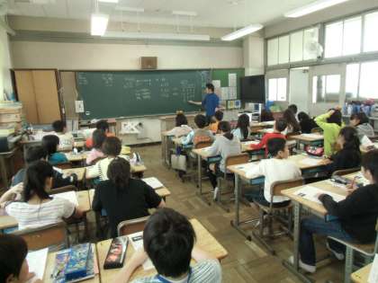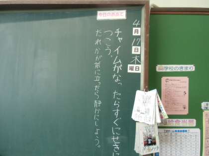 算数の時間、先生の説明にうなづきながら聞き入っています。習字の時間、なつかしいですね。黒板は、一日の目標を書いています。大事なことです。