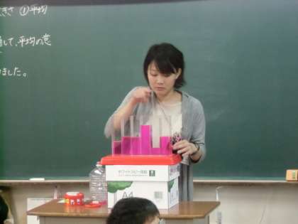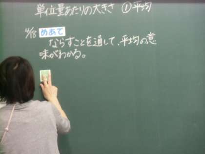 算数の「平均」について、学習する時間です。「ならす、てどういう意味ですか。」の先生の問いに、すぐに手が挙がりました。「なじんでいく。」という意味です。おお、確かにその意味で使うこともありますね。先生が、プラスチックの容器に多い少ないをわざとつくって、ジュースを注ぎます。「みんな、この小さい方の容器のジュースをあげる、て言われたらどう?」「いやです。多い方がいいです。」「そうですね、だから、こうします。」と先生が言って、容器のしきりを取ると、みんな同じ量になりました。「これを『ならす。』と言います。」この説明に、みんなが、なるほど、よくわかったの顔をしていました。