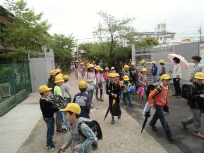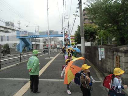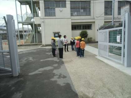 北門にもあいさつ運動の子どもたちががんばってくれました。3枚目は、あいさつ運動が終わってから、簡単に今日の反省会をしています。