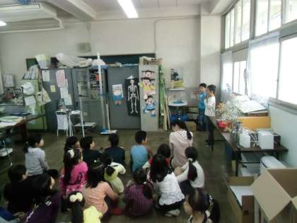 3年生が視力検査をやっていました。狭いところにきちんと並んですわっていました。