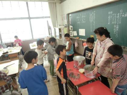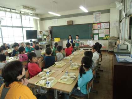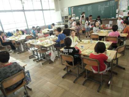 給食が運べたら、次は配膳です。はじめに多めに配って、自分には少し多いと思う人が返しに来るパターンが多いです。一年生は、はじめ少なく盛っています。