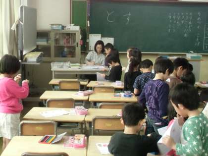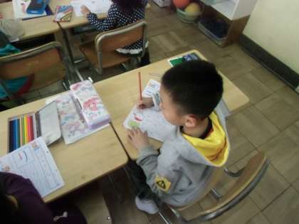 1年生の国語の授業です。今日は「り」を習いました。りんごの「り」ということで、ノートにりんごの絵があります。「り」を練習して、りんごに色ぬりをして先生に見てもらいます。
