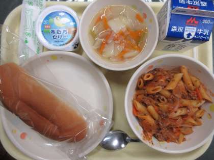 今日のメニューは、ベビーパン・ミートペンネ・野菜スープ・すだちゼリー・牛乳でした。