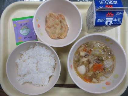 今日のメニューは、ご飯・八宝菜・豆腐ナゲット・ふりかけ・牛乳でした。
