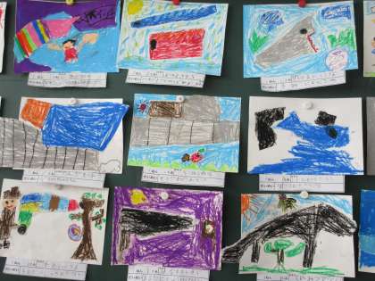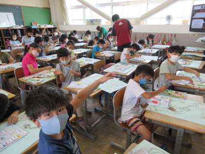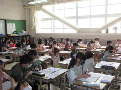 5時間目。1年生(図工:ちぎり絵作品)・2年生(国語)・3年生(図工)の様子です。