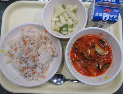 今日のメニューは、チキンピラフ・トマトのスープ煮・じゃがいもソテー・牛乳でした。