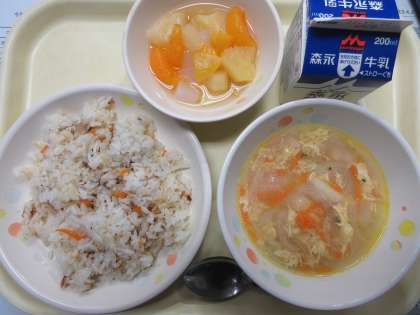 今日のメニューは、チキンピラフ・たまごスープ・フルーツナタデココ・牛乳でした。