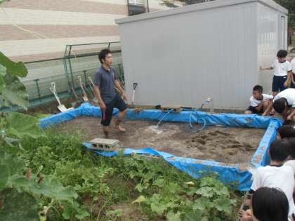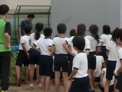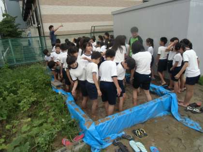 5年生が田植えの授業をしていました。先生が、「まず、土を柔らかくする必要があります。」と説明し、「こうやって柔らかくします。」と見本を示し、最後に子どもたちがミニ田んぼに入って、足でグネグネやっています。貴重な体験ですね。