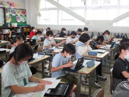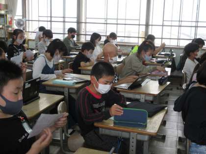5年生:眼科検診の順番待ちの時間を使って、調べ学習のプレゼンテーションに向けての資料づくりをしたり、遠足の行き先調べ等をしています。