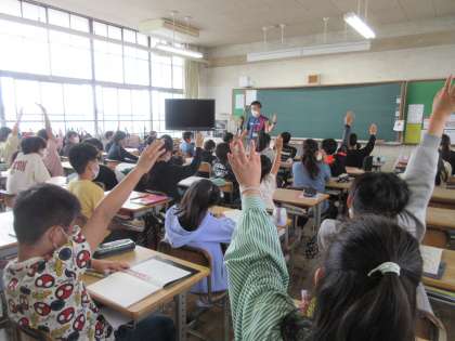 6年2組の国語科「笑うから楽しい」という説明文の授業参観です。