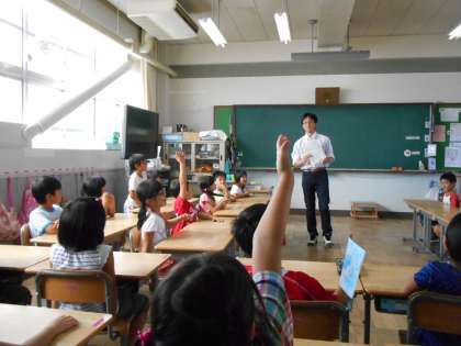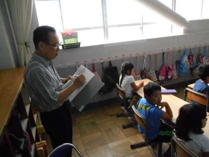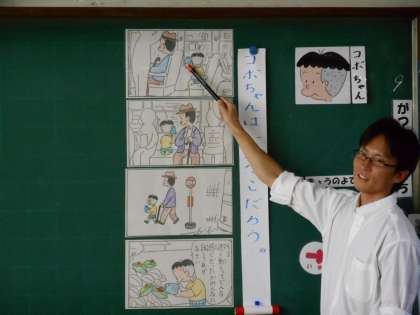今日の5時間目に1年3組で研究授業が行われました。講師は南郷小学校の前校長先生近重先生です。道徳の授業でした。新聞の四コママンガ、コボちゃんを題材に授業が進みました。