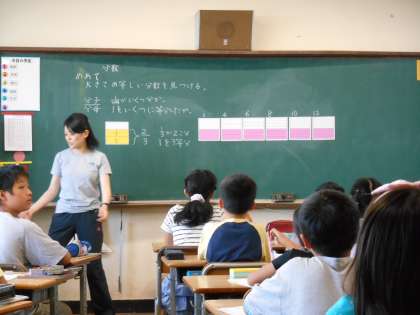5年生の算数の授業を見ました。分数の復習から始まり、同じ大きさの分数について勉強していました。発言がしっかりされ、最後に子どもたちの中から今日のゴールとなる答えが出ました。教科担任の先生に許可をもらって、子どもたちに「今日の授業は、よかったですね。いい勉強ができましたよ。」とほめました。