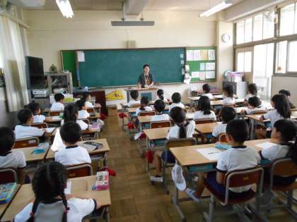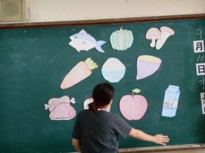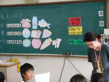 学校だよりで紹介させていただきました栄養教諭の実習に来ている先生の授業をのぞきました。3色栄養の勉強で、肉や魚が体を作り、ごはんやパンが体を動かし、野菜が体を守ることを楽しく勉強しました。子どもたち一生懸命、先生の言うことを聴いていました。