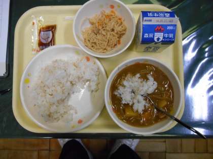 チキンカレー、切干大根サラダ、中華ドレッシング、むぎごはん、牛乳でした。ドレッシングをかけるのを忘れてしまいました。