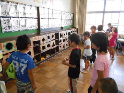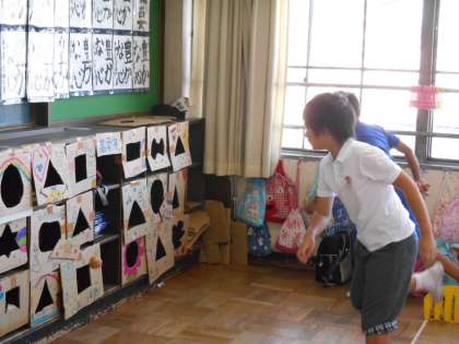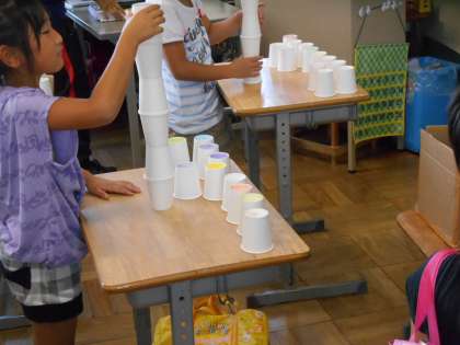 この写真は5年2組のコップタワーとストラックアウトです。コップタワーは難しいです。ストラックアウトは分かりやすく人気がありました。