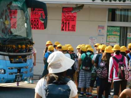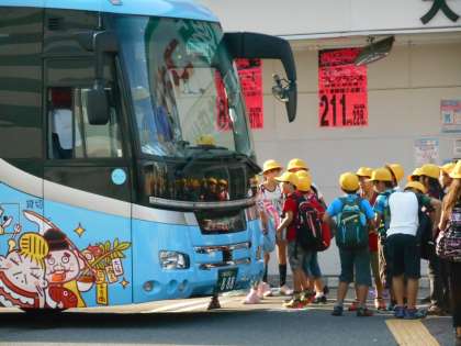 スギ薬局の前でバスに乗るところです。バスは2台で2組が1号車と2号車に分かれてのりました。