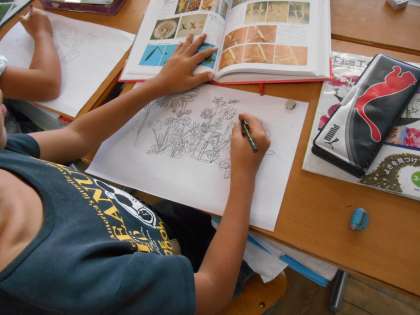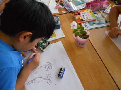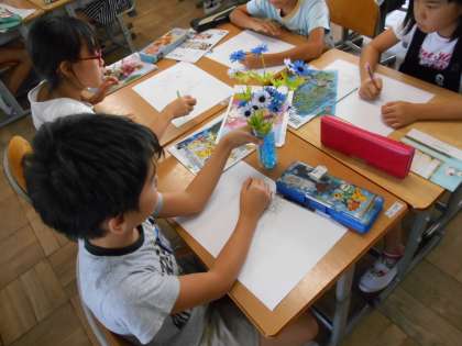 4年生の図工です。家から題材をもってきて、絵を描いていました。それが、丁寧に描かれていて、思わず指で○(いいよ、いいよの合図)を送っていました。