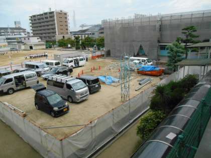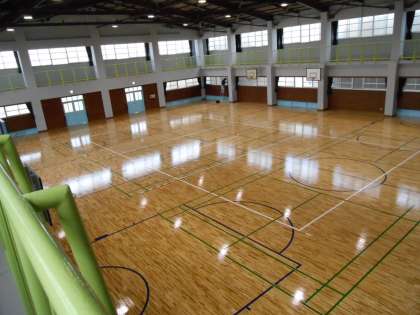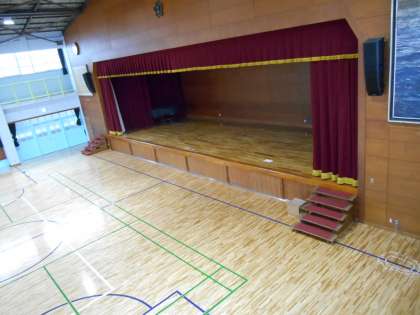 今日も体育館の中に入ることができました。ピカピカの床です。舞台も完成しています。