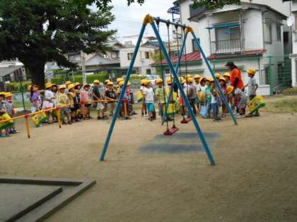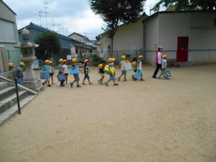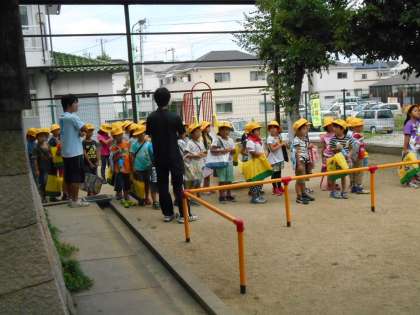 1年生のまち探検です。太子田神社につきました。ベンチの使い方、遊具の使い方を先生から教わっています。あたりまえのことだけど、それができれば安心な街になります。