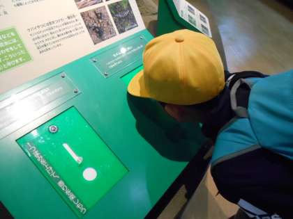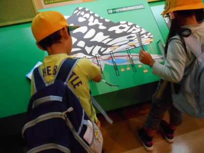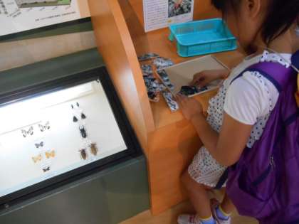 1枚目の写真は、チョウチョウの動態を切断して、断面図を見られるようにしてありました。2枚目の写真は、カメムシのにおいをかいでいます。強烈なにおいでした。3枚目は虫パズルを完成させています。