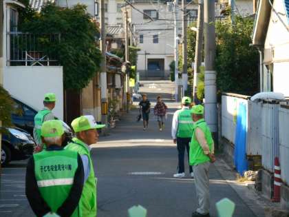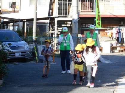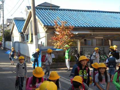 昨日の台風がうそのような見事な秋晴れ。今日も子どもたちは元気に登校しました。3枚目、最後に登校したグループは見守り隊の方全員で迎えられました。