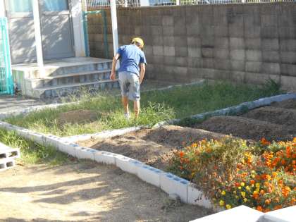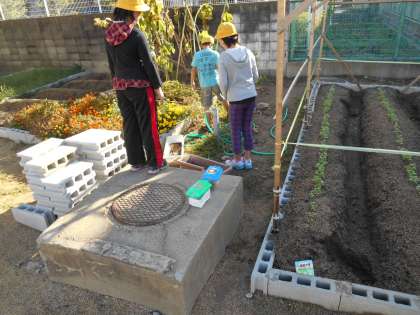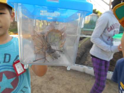 1枚目、これ何か分かりますか。かまきりの大きいのがいるんです。そのかまきりのえさになる虫を畑にさがしにきました。