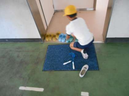 廊下を歩いていると、トレイのスリッパをきちんと並べている子どもに出会いました。うれしくて、うれしくて、撮影しました。