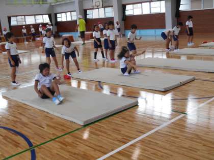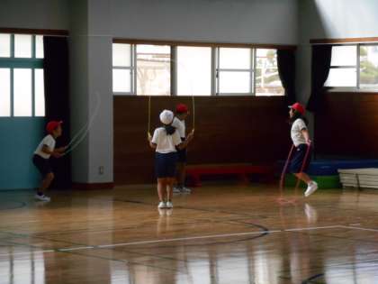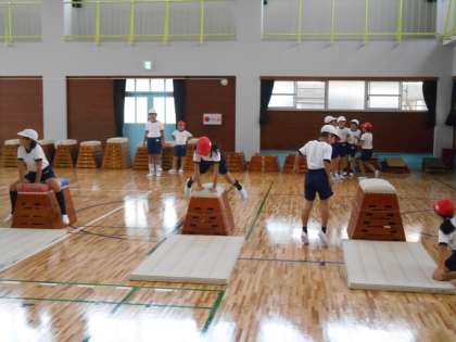 体育館で4年生の体育です。マット運動(前転・後転)、跳び箱、なわとびとグループに分かれての練習していました。どのグループもきちんとしていました。