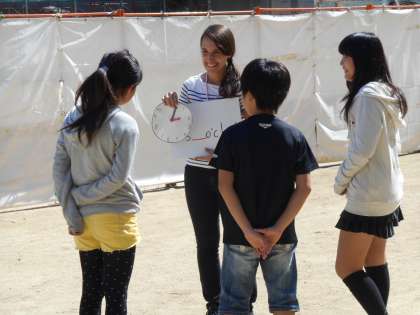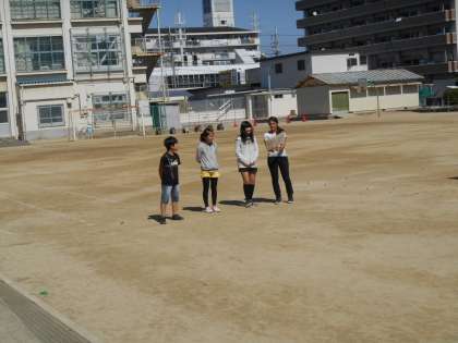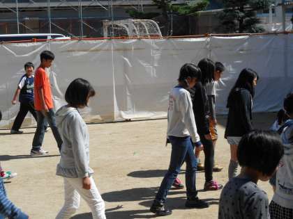 6年生の英語を運動場でやっていました。何事かと見ていると、2枚目にあるように、指示を出す人たちがいて、それを聞いてアクション(行動)する人たちがいました。英語で「今、11時です。」と言うと、後ろ向きに11歩動いていました。おもしろいですね。