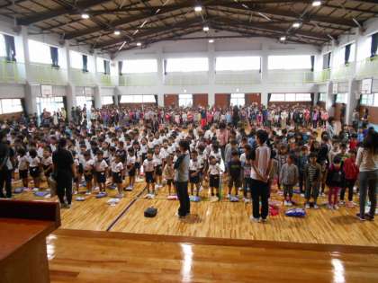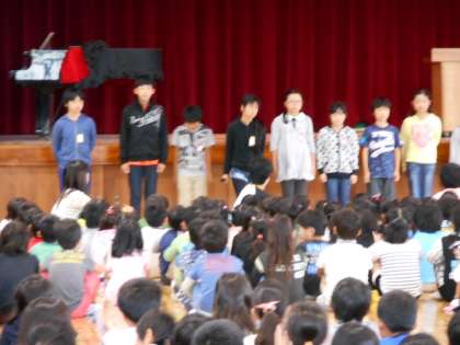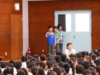 今日は月に一度の児童集会でした。新しくなった体育館で初めての集会です。後期の児童会の認証式が行われ、一人ずつ簡単なあいさつがありました。645人の前であいさつするって、すごいことですね。