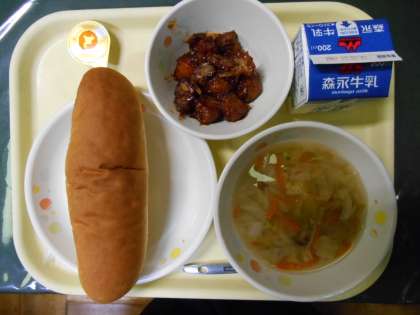 今日の給食は、カップバター、まぐろのケチャップ和え、こっぺぱん、野菜のスープ、牛乳でした。本当なら、こっぺぱんではなく、うずまきパンだったのですが、台風の予報が出ていたので、急きょ変更になりました。