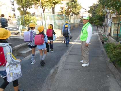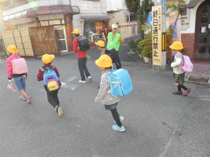 今日は一年生の遠足です。一年生たちが、リュックサックで登校しました。