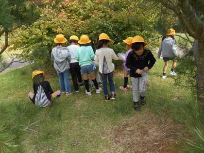 これぞ、秋空です。昼食のあと、もう一回遊びの時間があって、今日のメインイベント、「秋さがし」が始まりました。みんなで、ドングリや色づく葉をさがします。夢中になってやっていました。