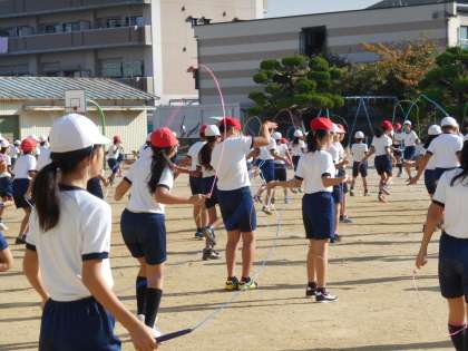 今日は、3年と5年の体力づくりが朝の時間にありました。初日ということで、服装、なわとびの適正さなどの話がありました。さっそく、見本になる人の演技があり、みんなで跳ぶことになりました。