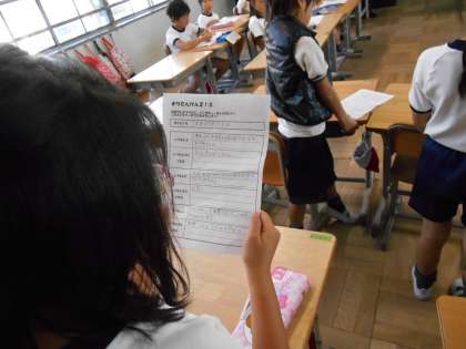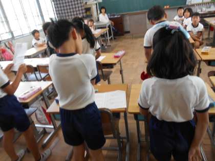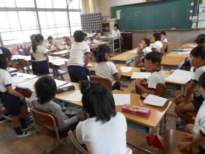 昨日のまちたんけんの振りかえりを2年生がやっていました。まず、自分で初めてしったこと、感想などを書いて、グループで交流し、発表していました。みんなの前で自分の感想を言うのは、なかなかたいへんですが、がんばっていました。