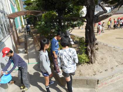 さて、この写真は何をしているところでしょうか。私が、職員室にいると、ダダダっと走ってきて、「せんせい、かまきりが死にました。花壇に埋めていいですか。」との質問。クラスで飼育していたかまきりらしく。むげに断れず、許可しました。花壇に埋め、お経?を上げている(2枚目)ところです。