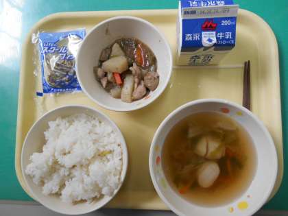今日の給食は、くりごはん、五目汁、鳥肉とじゃがいもの煮物、ミニフィッシュ、牛乳でした。くりごはんは、おいしいですね。こういう旬のものはほんとにおいしいです。